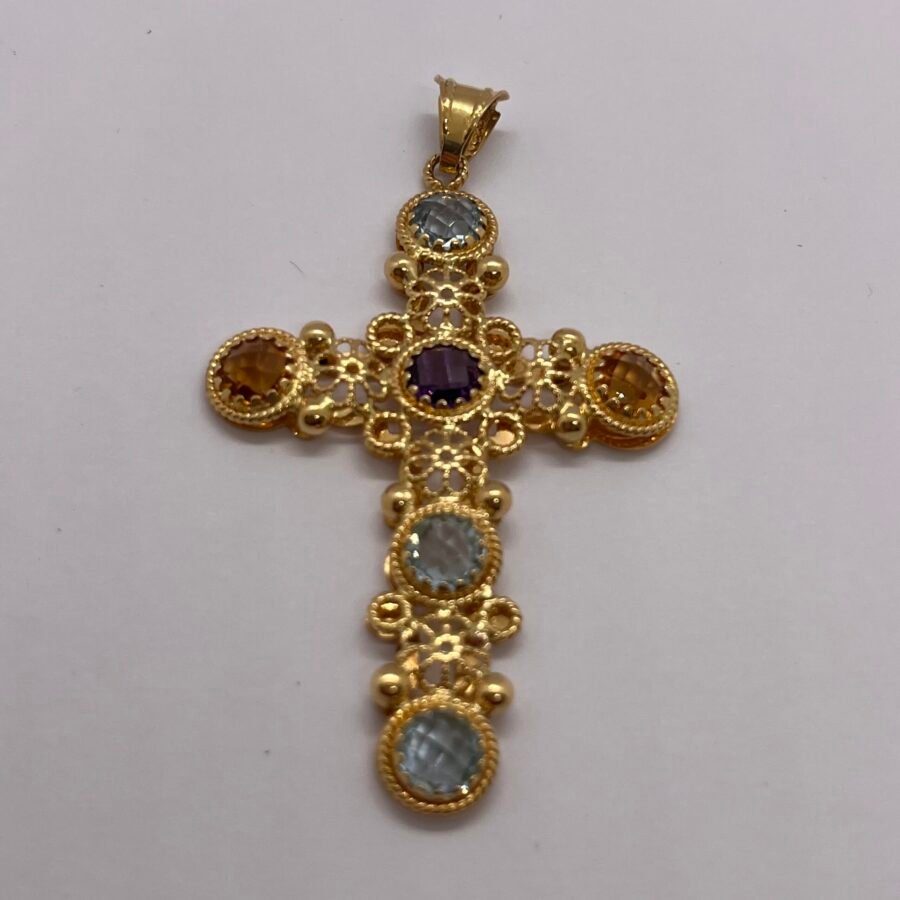Questo capolavoro si distingue non solo per l’utilizzo di materiali pregiati ma anche per i dettagli meticolosi. Le pietre colorate, perfettamente incastonate, aggiungono una vivacità irresistibile al design classico dell’oro giallo. Ogni pietra è accuratamente selezionata per garantire brillantezza e durabilità nel tempo. Con una forma grande e prominente, la croce diventa un punto focale che celebra la bellezza artigianale e l’essenza simbolica.
